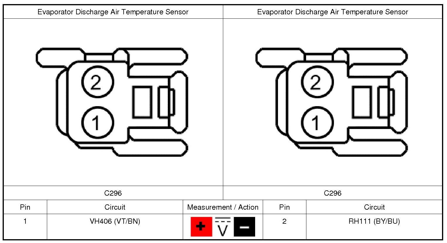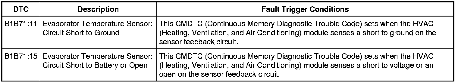 The evaporator discharge air temperature sensor is used for A/C (Air Conditioning) compressor cycling. An accurate evaporator temperature is critical to prevent evaporator icing. The HVAC (Heating, Ventilation, and Air Conditioning) module uses the temperature measurement to turn off the A/C (Air Conditioning) compressor before the evaporator temperatures are cold enough to freeze the condensation. This prevents ice blockage of airflow over the evaporator core.