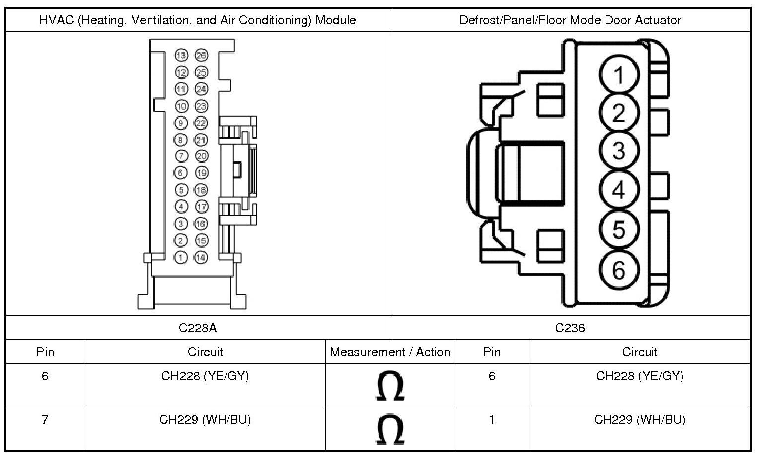 NOTE: Access to the defrost/panel/floor mode door actuator motor connector in this pinpoint test is difficult. Before disconnecting the defrost/panel/floor mode door actuator motor connector, visually inspect the actuator and its harness for obvious damage. If no damage is evident, proceed with the test.