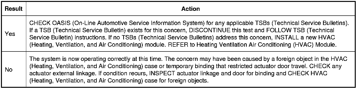 During an actuator calibration cycle, the HVAC (Heating, Ventilation, and Air Conditioning) module drives the defrost/panel/floor mode door until the door reaches both internal stops in the HVAC (Heating, Ventilation, and Air Conditioning) case. If the defrost/panel/floor mode door is temporarily obstructed or binding during a calibration cycle, the HVAC (Heating, Ventilation, and Air Conditioning) module may interpret this as the actual end of travel for the door. When this condition occurs and the HVAC (Heating, Ventilation, and Air Conditioning) module commands the actuator to its end of travel, the airflow may not be from the expected outlets.