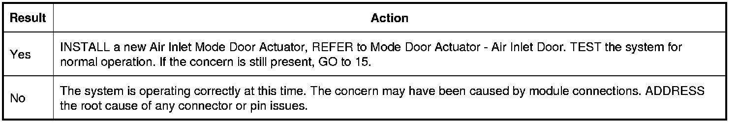 14. CHECK FOR CORRECT AIR INLET MODE DOOR ACTUATOR OPERATION