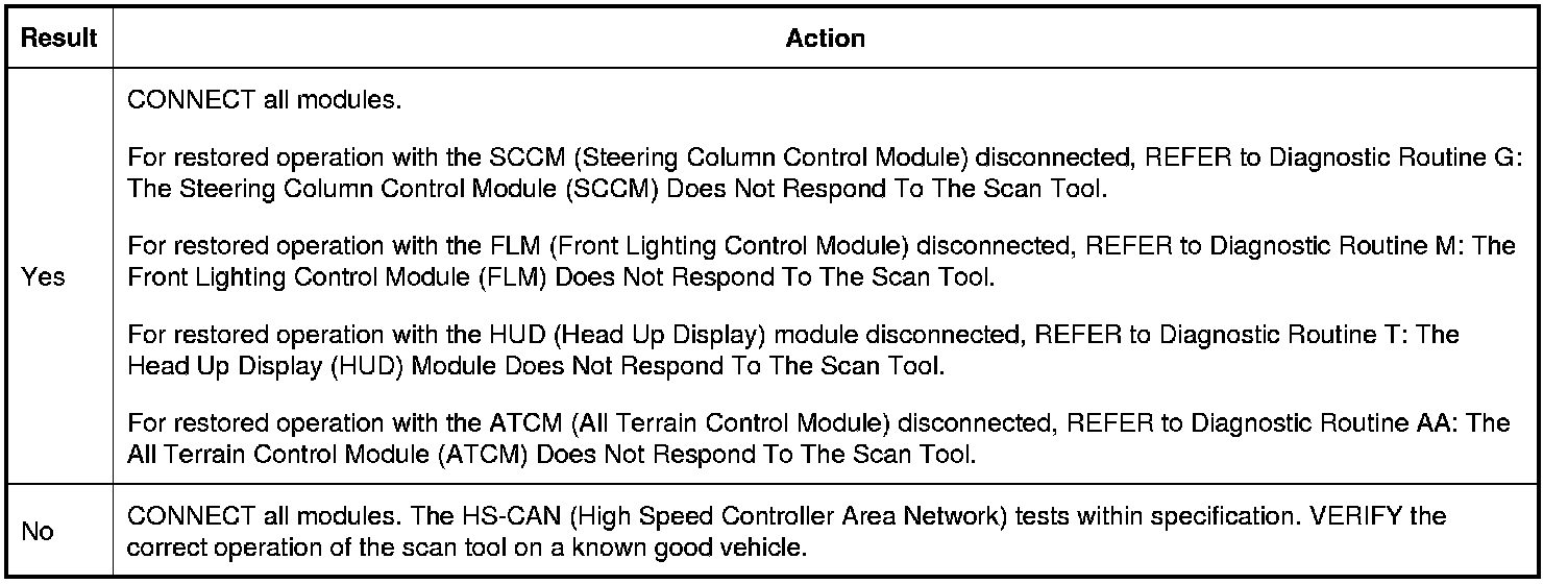 1. Disable modules one at a time until other HS-CAN (High Speed Controller Area Network) modules pass the network test. Skip to the end once network operation is restored.