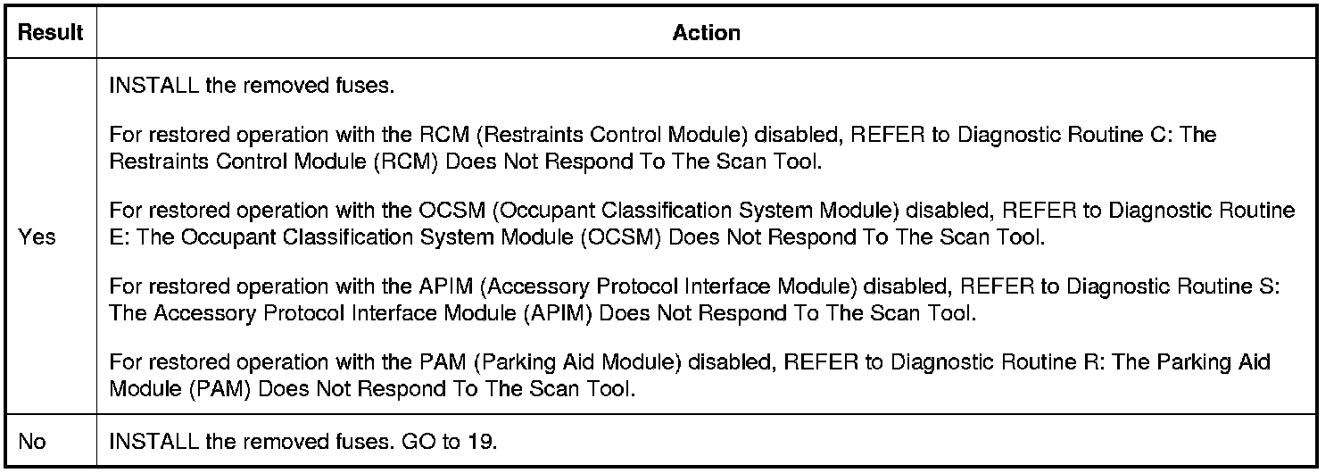 18. CHECK FOR RESTORED NETWORK COMMUNICATION WITH THE RCM (Restraints Control Module), OCSM (Occupant Classification System Module), PAM (Parking Aid Module), AND THE APIM (Accessory Protocol Interface Module) DISABLED