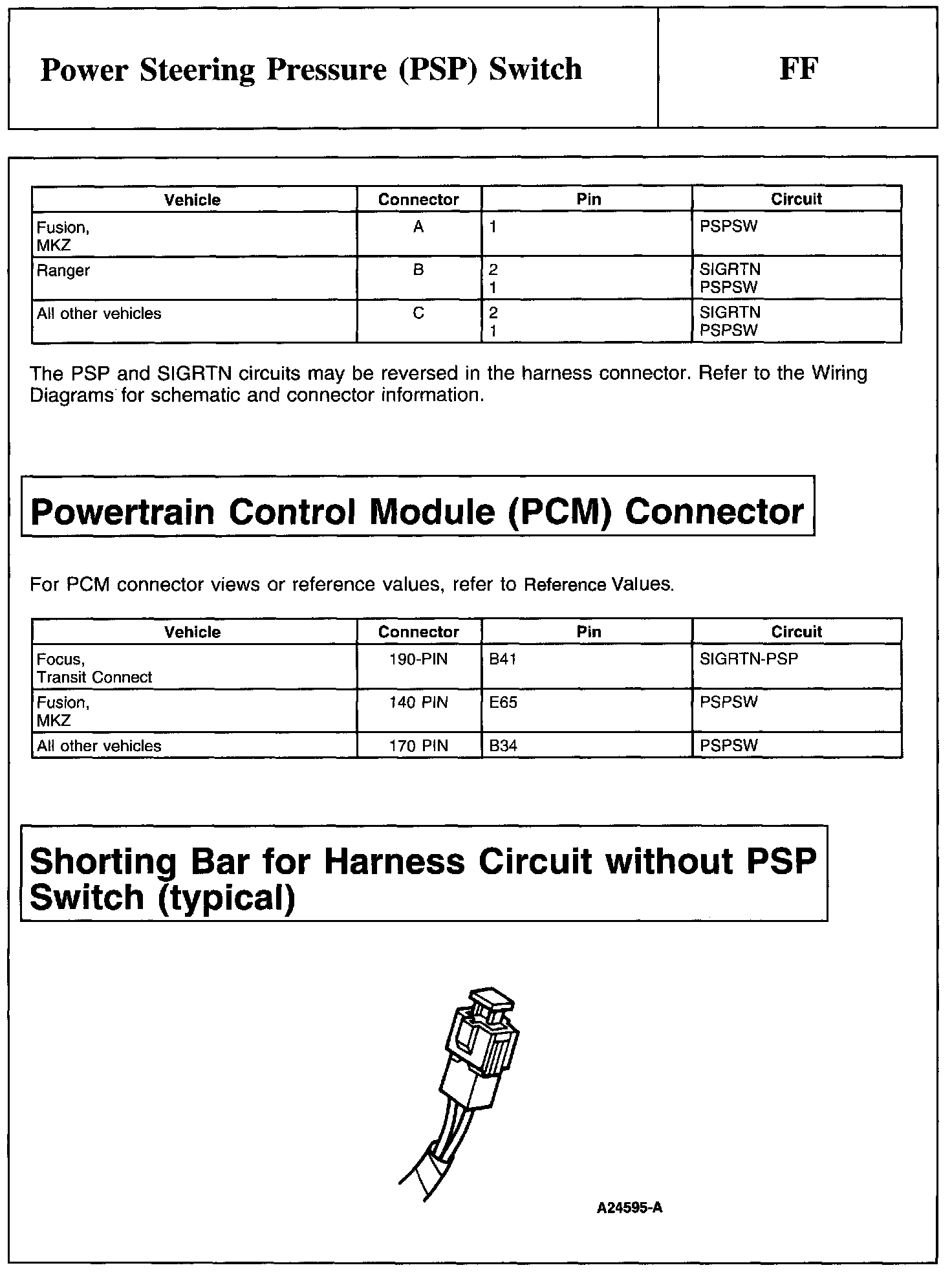 Power Steering Pressure (PSP) Switch Connector, Powertrain Control Module (PCM) Connector And Shorting Bar For Harness Circuit Without PSP Switch (Typical):
