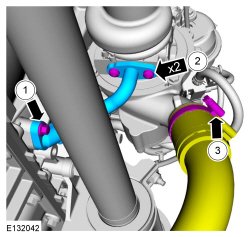 Arrows containing x numbers (Illustration 2) indicate the number of identical fasteners or connectors to be removed or installed in the graphic. In Illustration 2, two identical fasteners are indicated by the x2 arrow, with another arrow illustrating a third fastener of a different type. Because the different fasteners require different torques, callouts are used to identify those two torque values in the associated step text. The hose clamp is another fastener to be removed. The yellow coloring of the hose indicates it is to be moved aside (not removed).