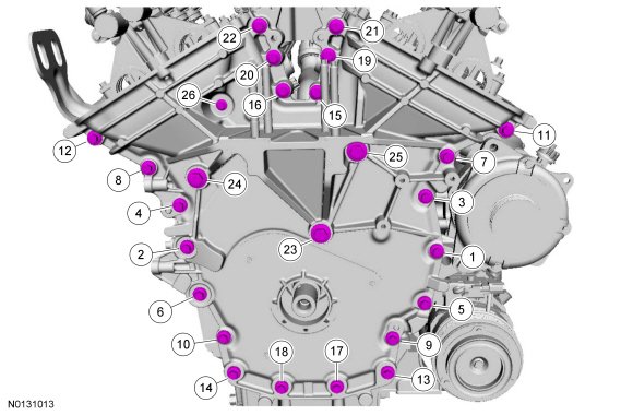 Stage 5: Tighten bolts 23 through 25 to 30 Nm (22 lb-ft) plus an additional 90 degrees.