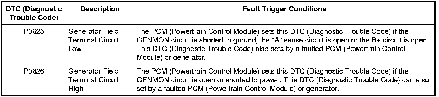 The PCM (Powertrain Control Module) monitors the generator output via the generator monitor (GENMON) circuit (generator field terminal circuit). If the PCM (Powertrain Control Module) cannot read the GENMON circuit due to an open or short to ground, when the engine speed is greater than approximately 2,000 RPM (Revolutions Per Minute), the generator defaults to a steady voltage of approximately 13.5 volts and the PCM (Powertrain Control Module) sends a request to the IPC (Instrument Panel Cluster) to illuminate the charging system warning indicator. A GENMON duty cycle of 3% or less indicates a short to ground fault is present and results in DTC (Diagnostic Trouble Code) P0625 setting in the PCM (Powertrain Control Module). A GENMON duty cycle of 98% or more indicates an open or short to voltage fault is present and results in DTC (Diagnostic Trouble Code) P0626 setting in the PCM (Powertrain Control Module).