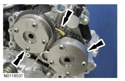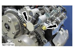 14. Assemble the 2 LH (Left Hand) VCT (Variable Camshaft Timing) assemblies and the LH (Left Hand) secondary timing chain.