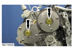 22. Install the 2 new RH (Right Hand) VCT (Variable Camshaft Timing) bolts and tighten in 4 stages:
