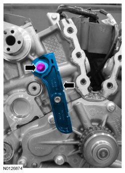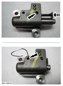 Compress the RH (Right Hand) secondary timing chain tensioner and install the Secondary Chain Hold Down to retain the tensioner in the collapsed position.
