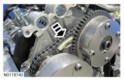 Compress the LH (Left Hand) secondary timing chain tensioner and remove the Secondary Chain Hold Down.