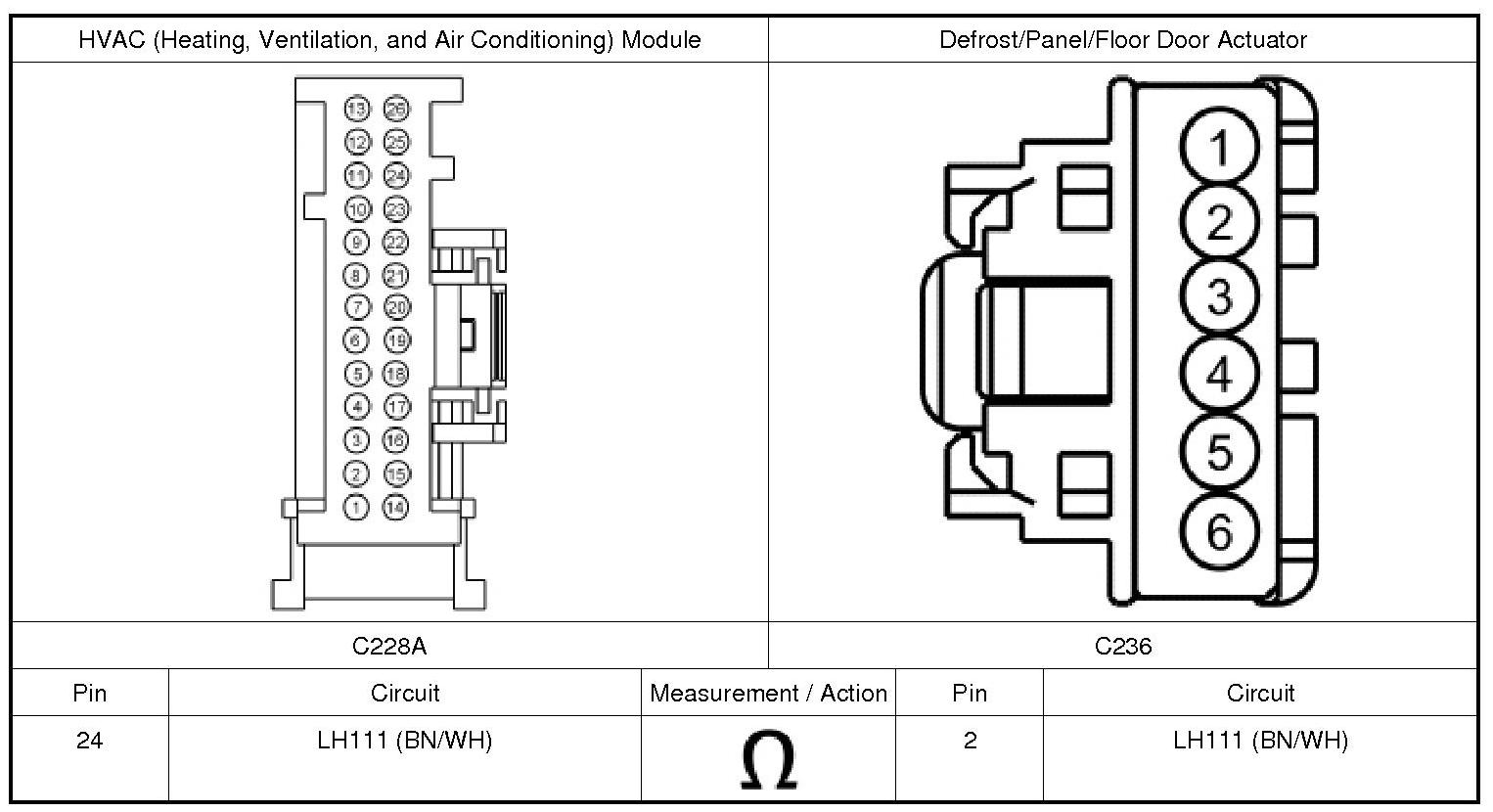 To rotate the defrost/panel/floor mode door actuator, the HVAC (Heating, Ventilation, and Air Conditioning) module supplies voltage and ground to the defrost/panel/floor mode door actuator motor through the actuator motor circuits. To reverse the defrost/panel/floor mode door actuator rotation, the HVAC (Heating, Ventilation, and Air Conditioning) module reverses the voltage and ground circuits.