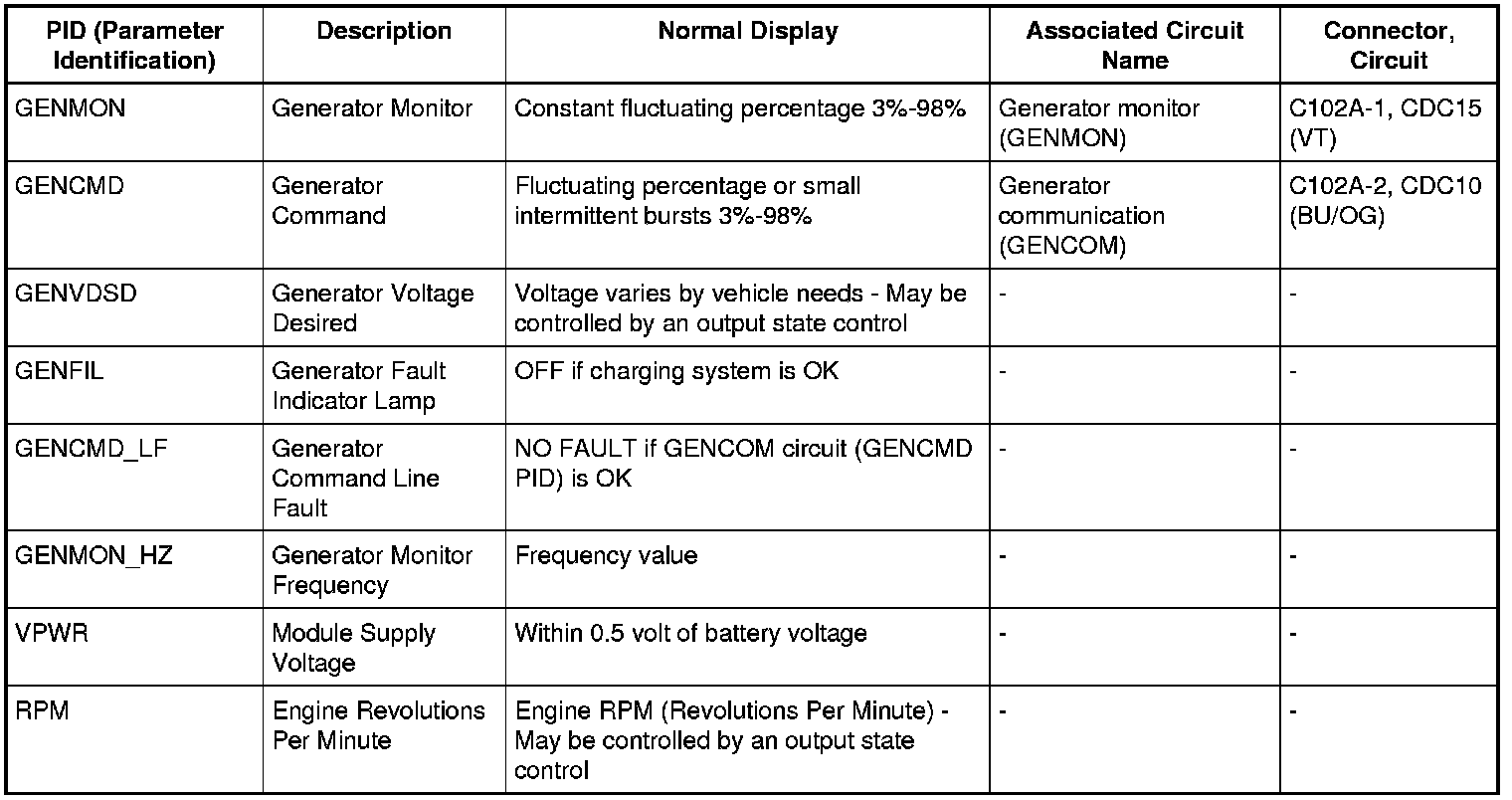 The PIDs (Parameter Identifications) and their associated descriptions used in the charging system diagnosis are listed below:
