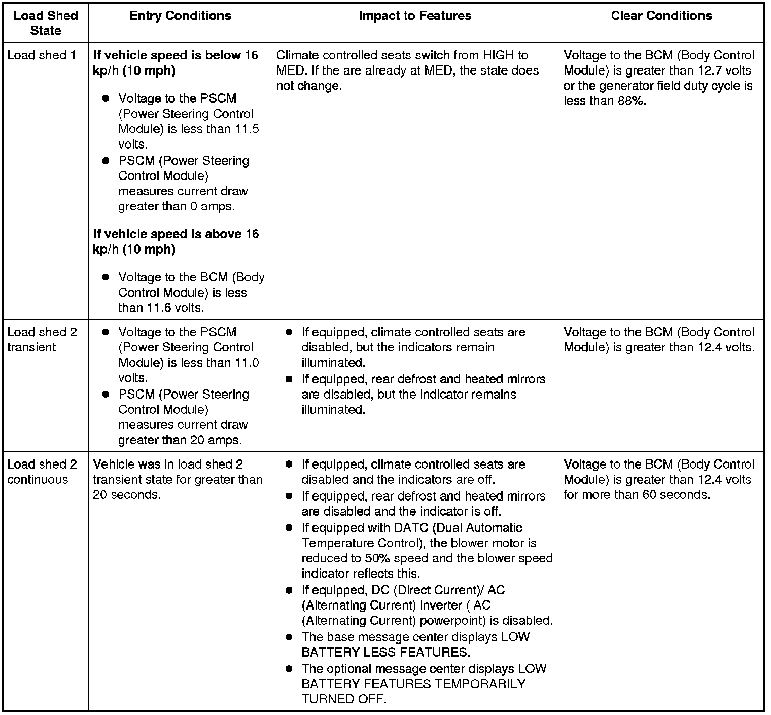 This vehicle is equipped with load shed strategy. With the engine off, the BCM (Body Control Module) monitors the battery state of charge using the battery current sensor attached to the negative battery cable. With the engine running, the BCM (Body Control Module) monitors system system voltage to the BCM (Body Control Module) and PSCM (Power Steering Control Module).