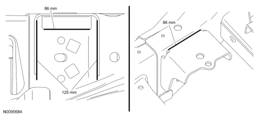 WARNING: Frame rail crush zones absorb crash energy during a collision and must be replaced if damaged. Straighten damaged frame rails to correct frame dimensions prior to frame member sectioning. Failure to follow these instructions may adversely affect frame rail performance and may result in serious personal injury to vehicle occupant(s).