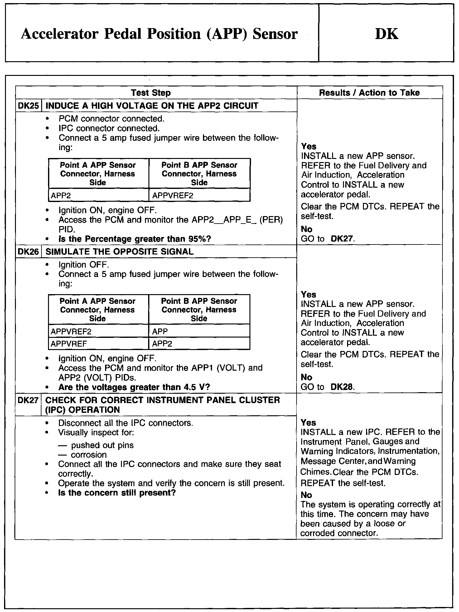Home >> Ford >> 2011 >> F 150 2WD V6-3.7L >> Repair and Diagnosis >> Powertrain Management >> Computers and Control Systems >> Testing and Inspection >> Pinpoint Tests >> Test DK: Accelerator Pedal Position (APP) Sensor