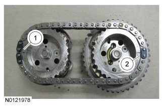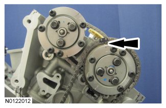 Install the secondary timing chain onto the LH VCT assemblies. Align the colored links on the secondary timing chain with the timing marks on the VCT assemblies as shown in the illustration.