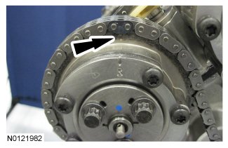 - Align the colored link on the timing chain with the timing mark on the RH VCT assembly.