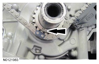 - Align the colored link on the timing chain with the timing mark on the LH VCT assembly.