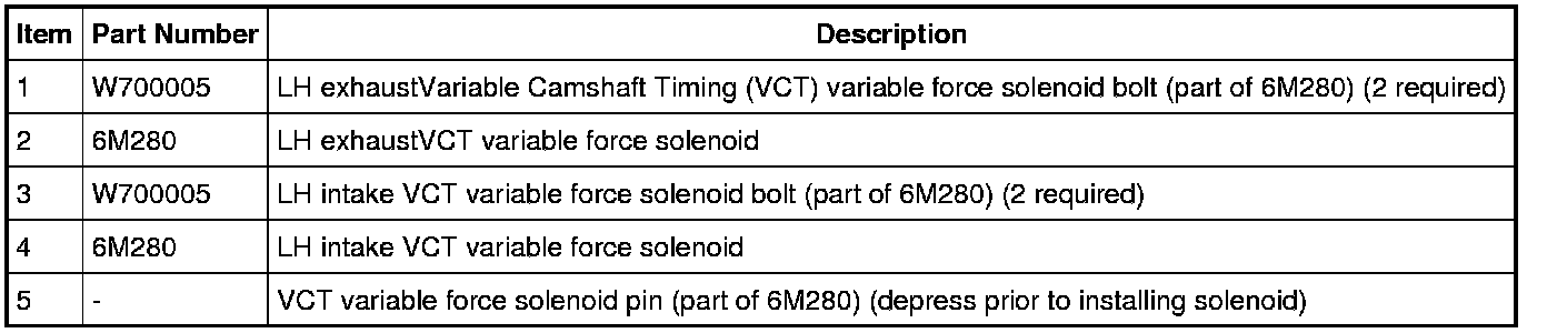 NOTICE: The Variable Camshaft Timing (VCT) variable force solenoid pins must be fully depressed to avoid interference with the VCT valve tips when installing the solenoids. Failure to follow these instructions can result in damage to the engine.