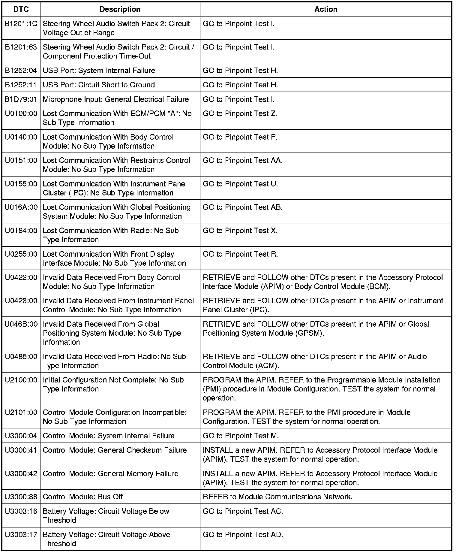 Home >> Ford >> 2011 >> Fiesta L4-1.6L >> Repair and Diagnosis >> Accessories and Optional Equipment >> Testing and Inspection >> Diagnostic Trouble Code Tests and Associated Procedures >> Accessory Protocol Interface Module (APIM) DTC Chart