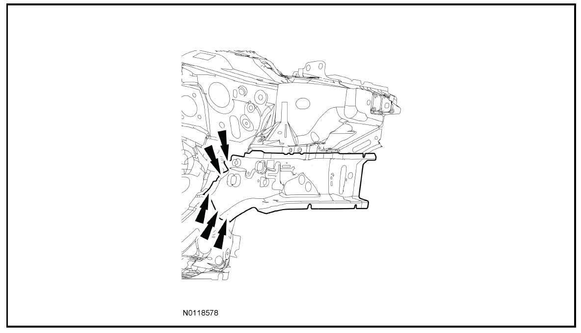 NOTICE: A frame rail sectioning kit is not available for this vehicle. Frame rail replacement must be done at the factory seams. Failure to follow this direction will result in an incorrect repair and vehicle energy management will be compromised.