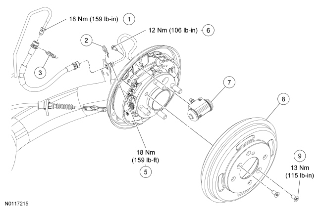 NOTE: If removing the the drum brake backing plate, the wheel hub and bearing must be removed. For additional information, refer to Rear Suspension Rear Suspension