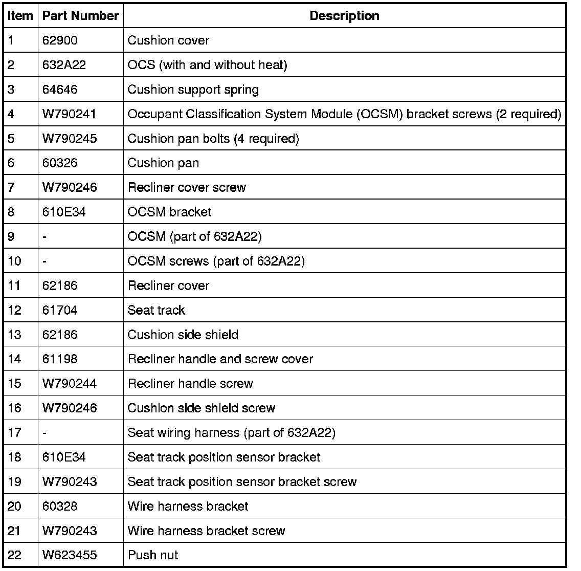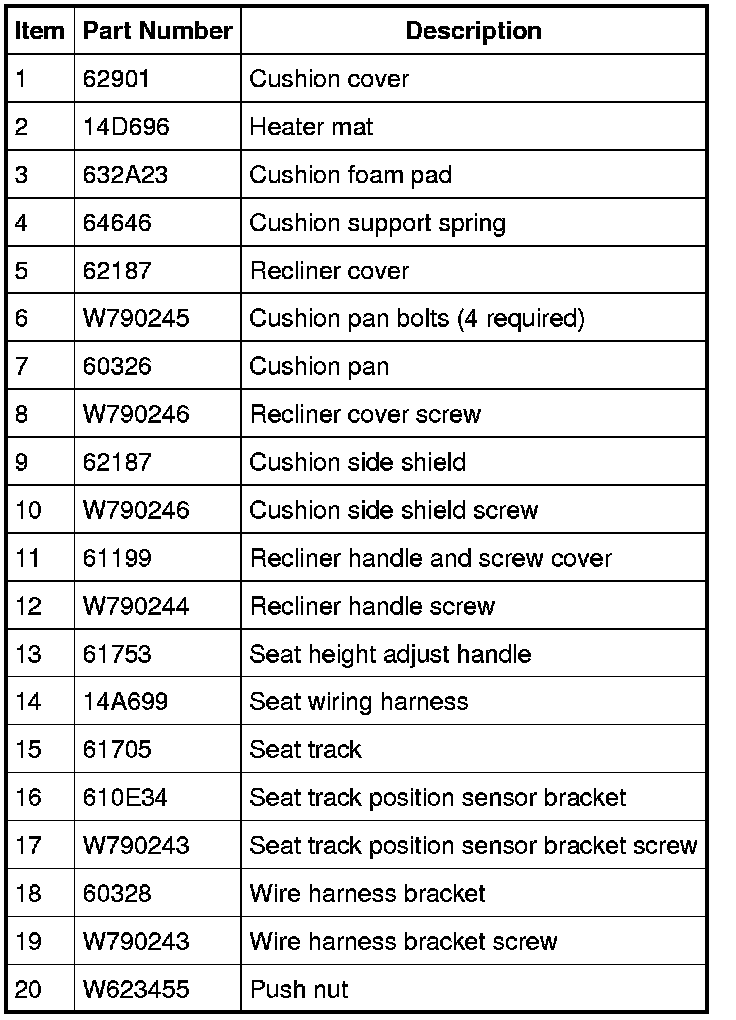 NOTE: For passenger seat cushion Occupant Classification System (OCS) system components, refer to Supplemental Restraint System Air Bag Systems.