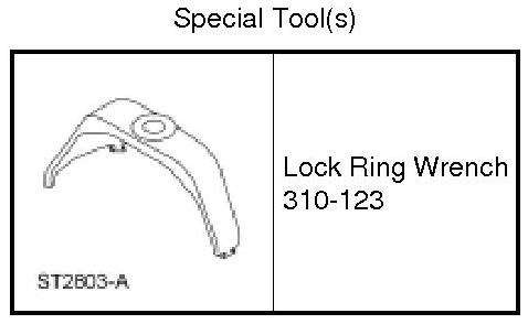 2. NOTICE: Carefully install the lock ring wrench to avoid damaging the Fuel Pump (FP) module when removing the lock ring