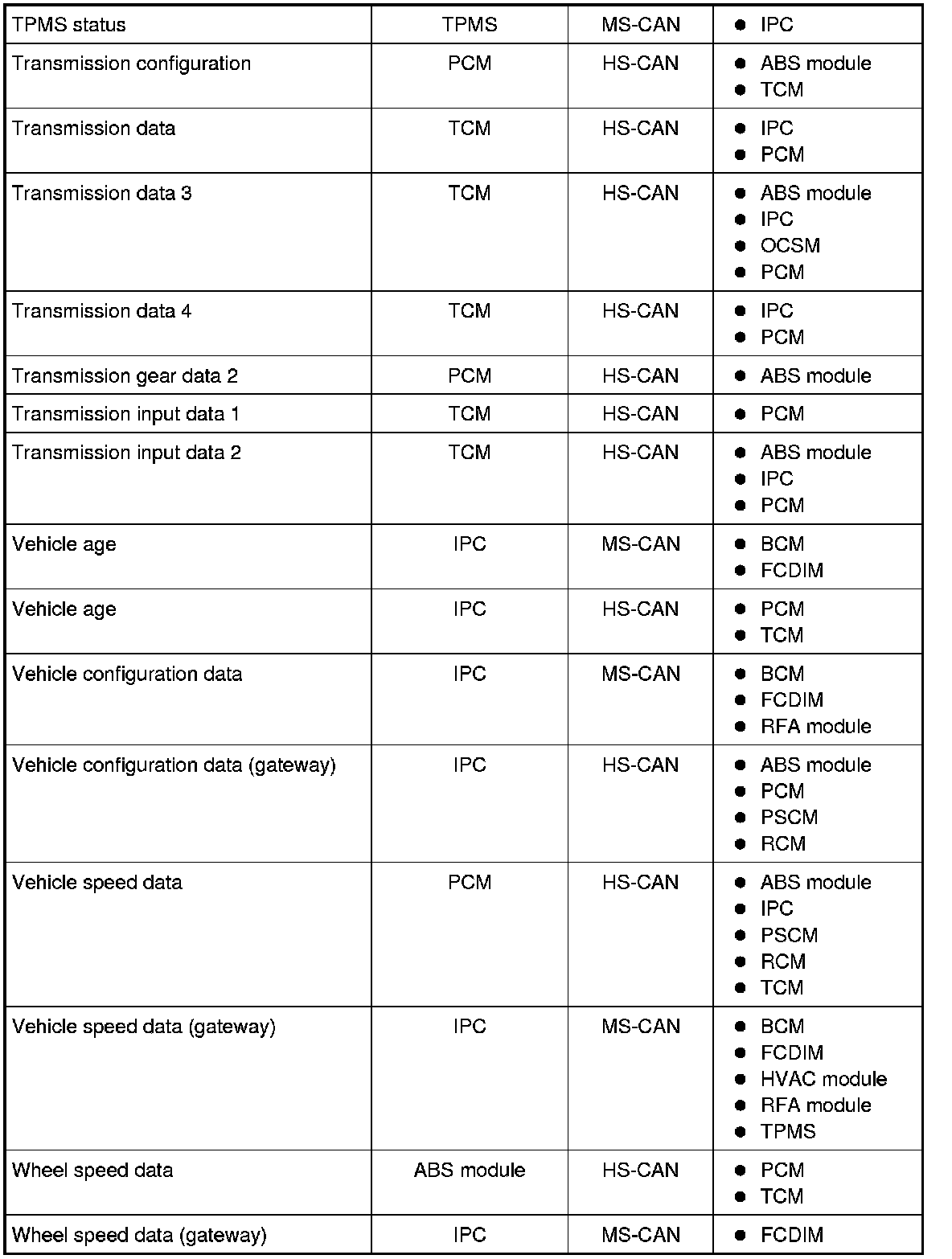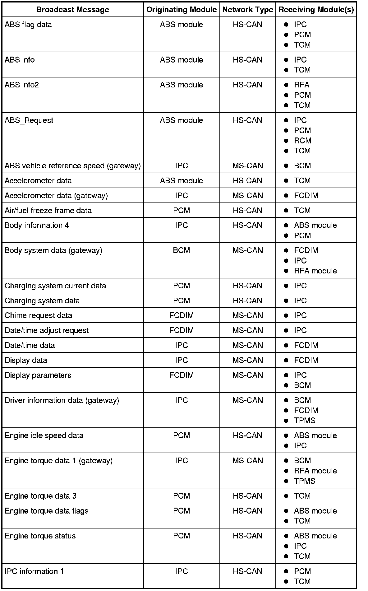NOTE: This chart describes the specific HS-CAN and MS-CAN messages broadcast by each module, and the module(s) that receive the message.