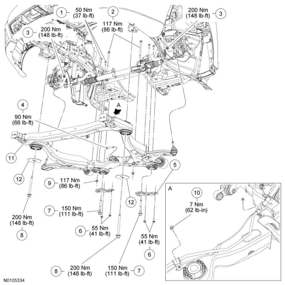 Tighten the 4 new subframe bracket-to-body bolts to 55 Nm (41 lb-ft).
