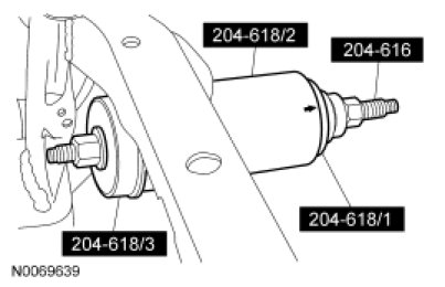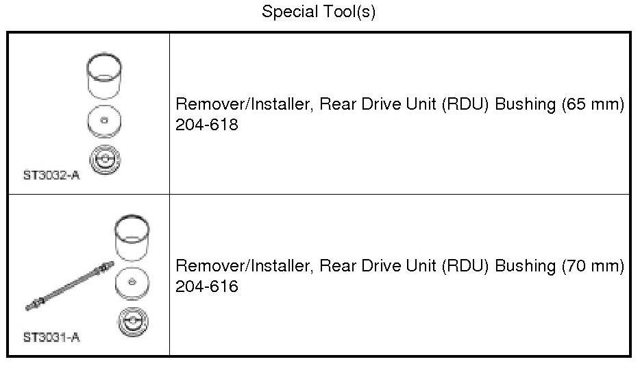 NOTE: When installing the RDU bushing, Rear Drive Unit (RDU) Bushing (65 mm) Remover/Installer 204-618/2 will fall away as the RDU bushing is installed into the subframe. The Rear Drive Unit (RDU) Bushing (70 mm) Remover/Installer does not control the depth of the bushing. The RDU bushing is fully seated when the Rear Drive Unit (RDU) Bushing (70 mm) Remover/Installer falls away from the subframe, do not continue to tighten the Rear Drive Unit (RDU) Bushing (70 mm) Remover/Installer.