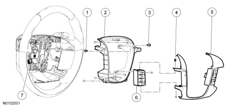 5. NOTICE: Lightly hand-tighten the screws. Do not use power tools. Failure to follow this instruction may result in damage to the steering wheel switch bezel or the steering wheel bezel box.