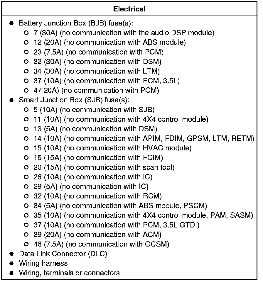 Home >> Ford >> 2011 >> Flex AWD V6-3.5L >> Repair and Diagnosis >> Powertrain Management >> Computers and Control Systems >> Information Bus >> Testing and Inspection >> Initial Inspection and Diagnostic Overview >> Module Communications Network >> Inspection and Verification