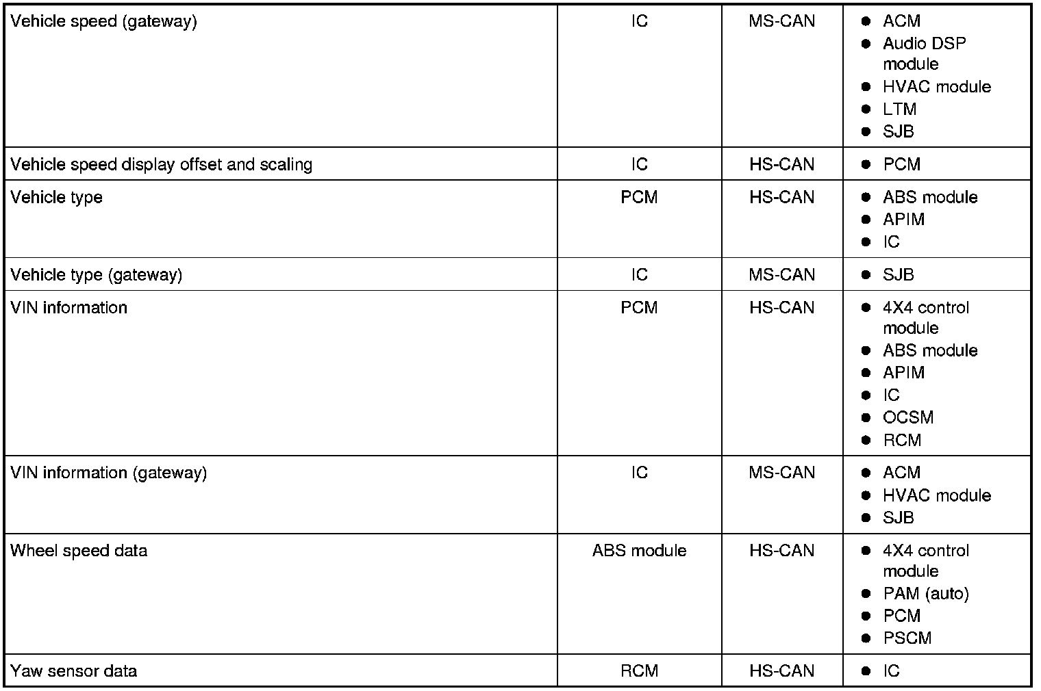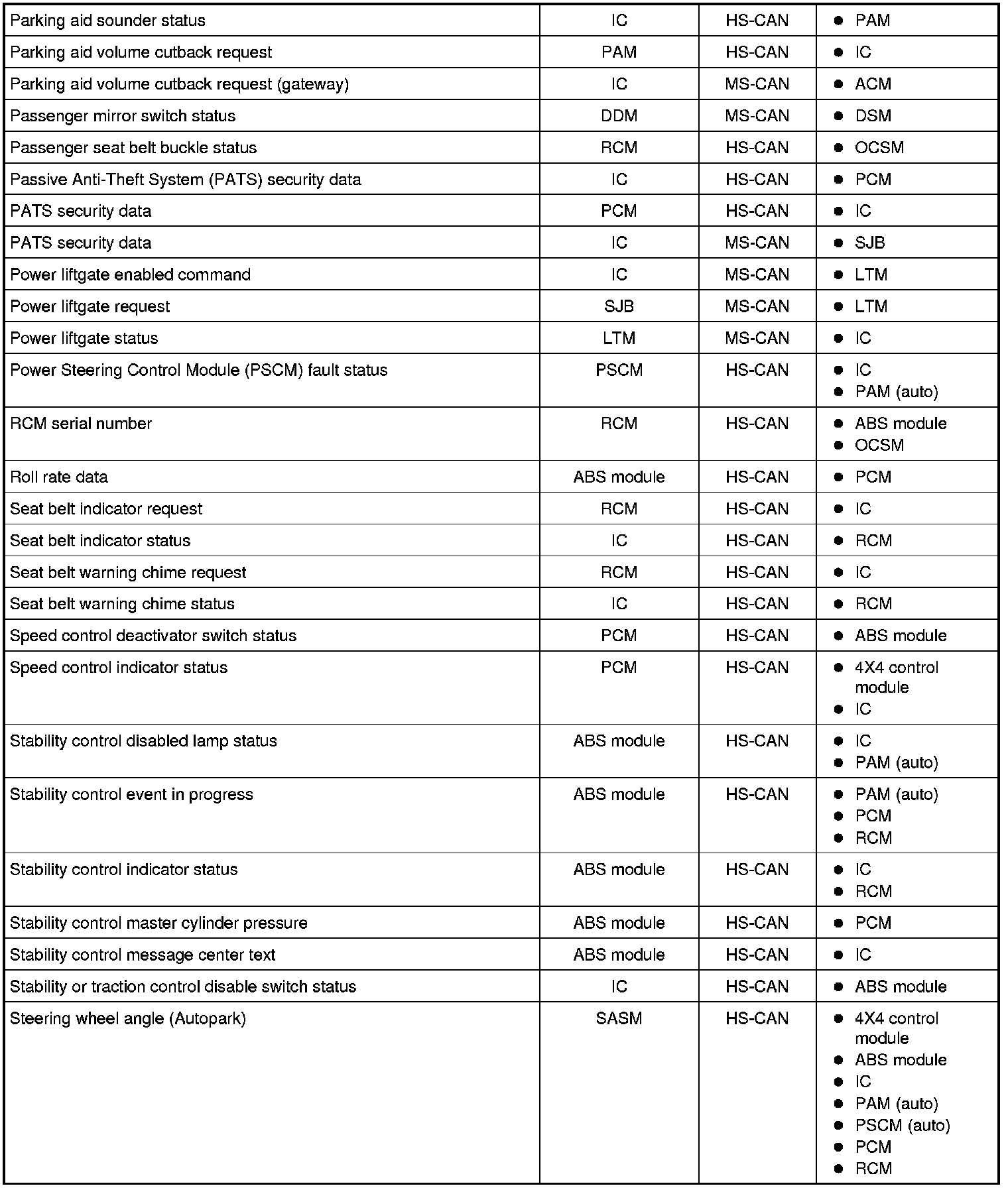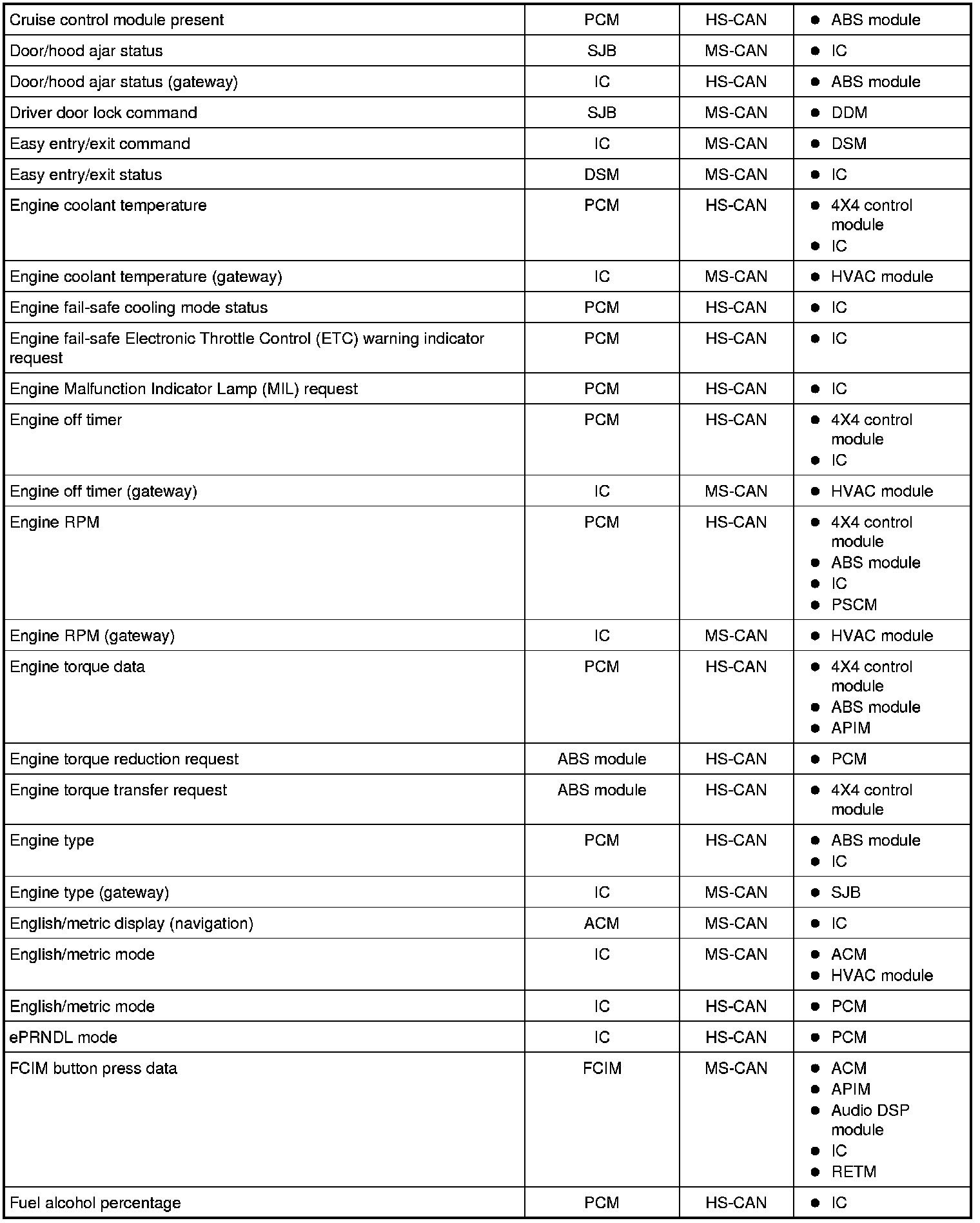 NOTE: This chart describes the specific HS-CAN and MS-CAN messages broadcast by each module, and the module(s) that receive the message.