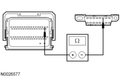 - Measure the resistance between the PCM C1381b-58, circuit VDB05 (WH), harness side and the DLC C251-14, circuit VDB05 (WH), harness side.