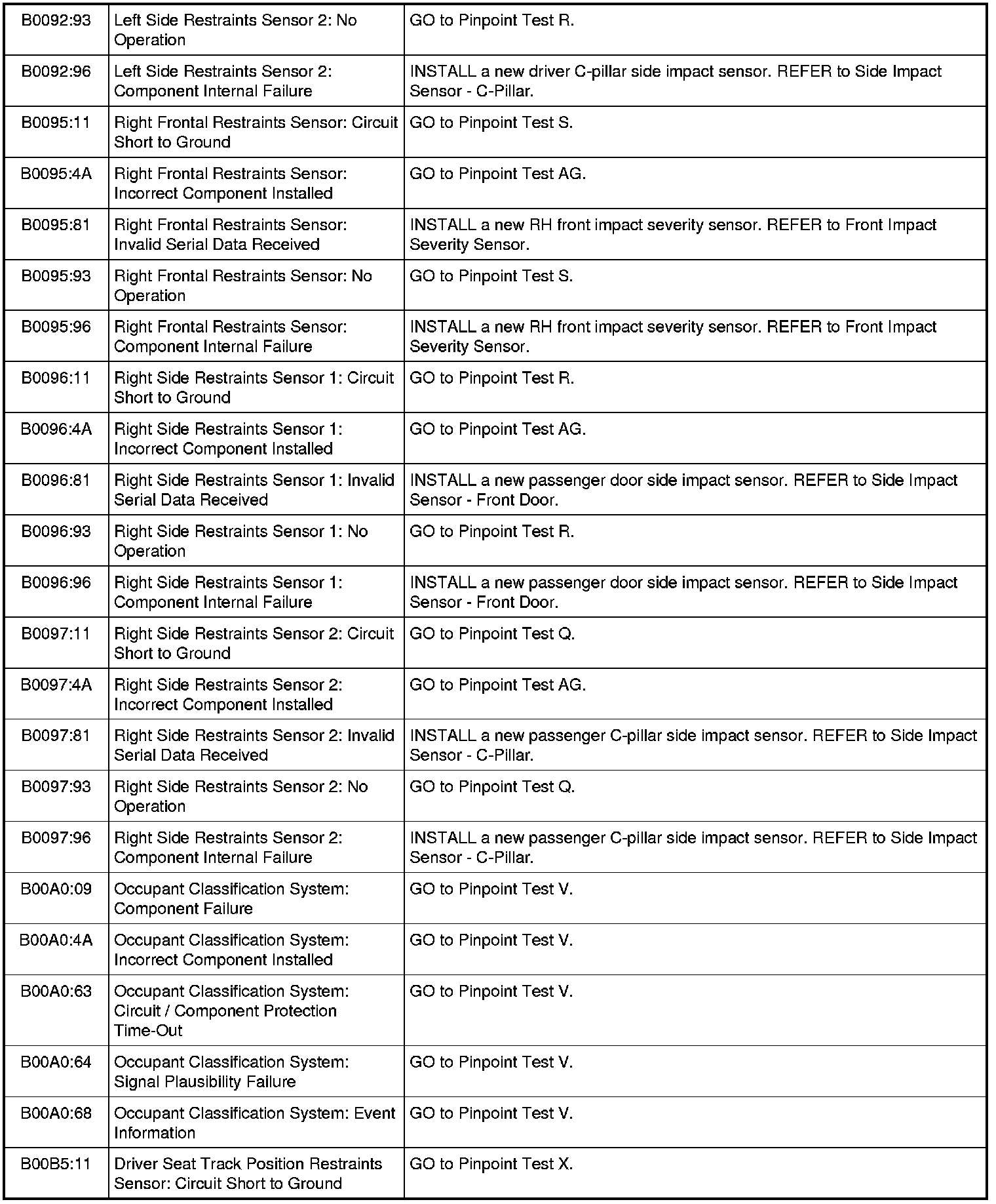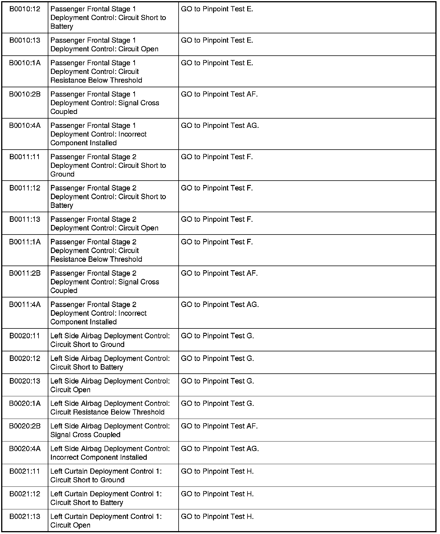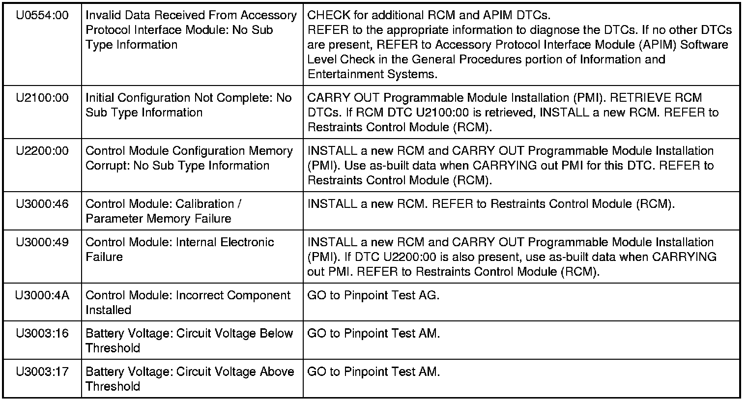Home >> Ford >> 2011 >> Flex AWD V6-3.5L >> Repair and Diagnosis >> Restraints and Safety Systems >> Air Bag Systems >> Testing and Inspection >> Diagnostic Trouble Code Tests and Associated Procedures >> Restraints Control Module (RCM) DTC Chart