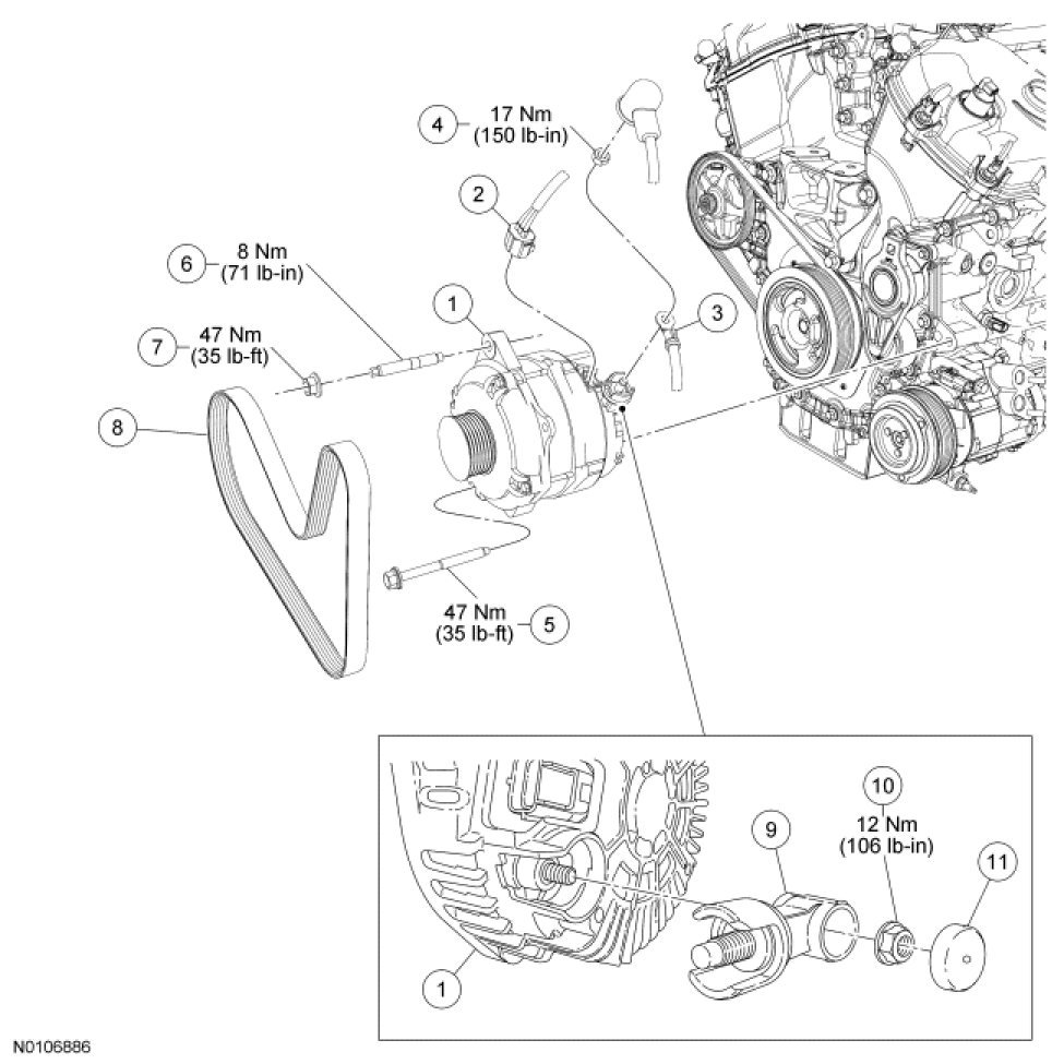 - Tighten the generator nut to 47 Nm (35 lb-ft).