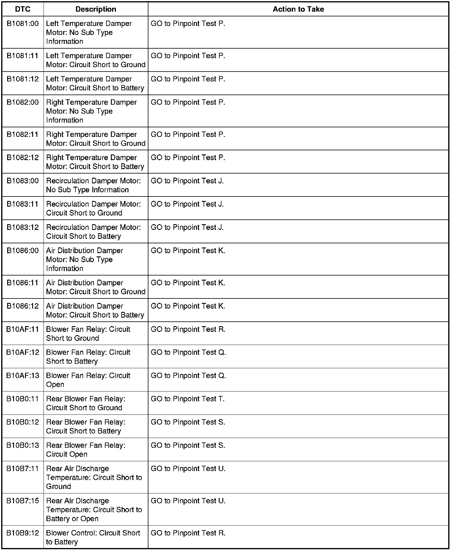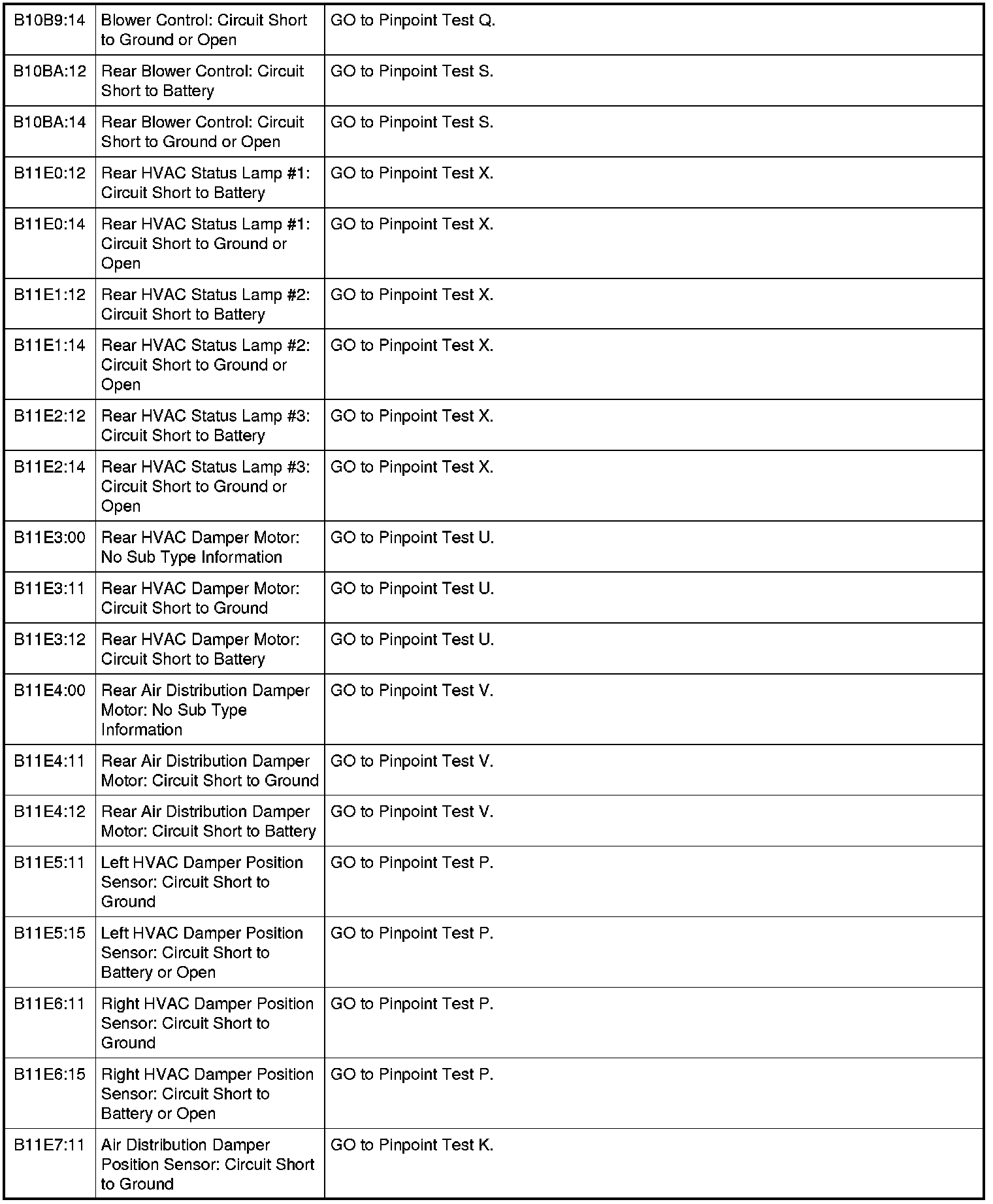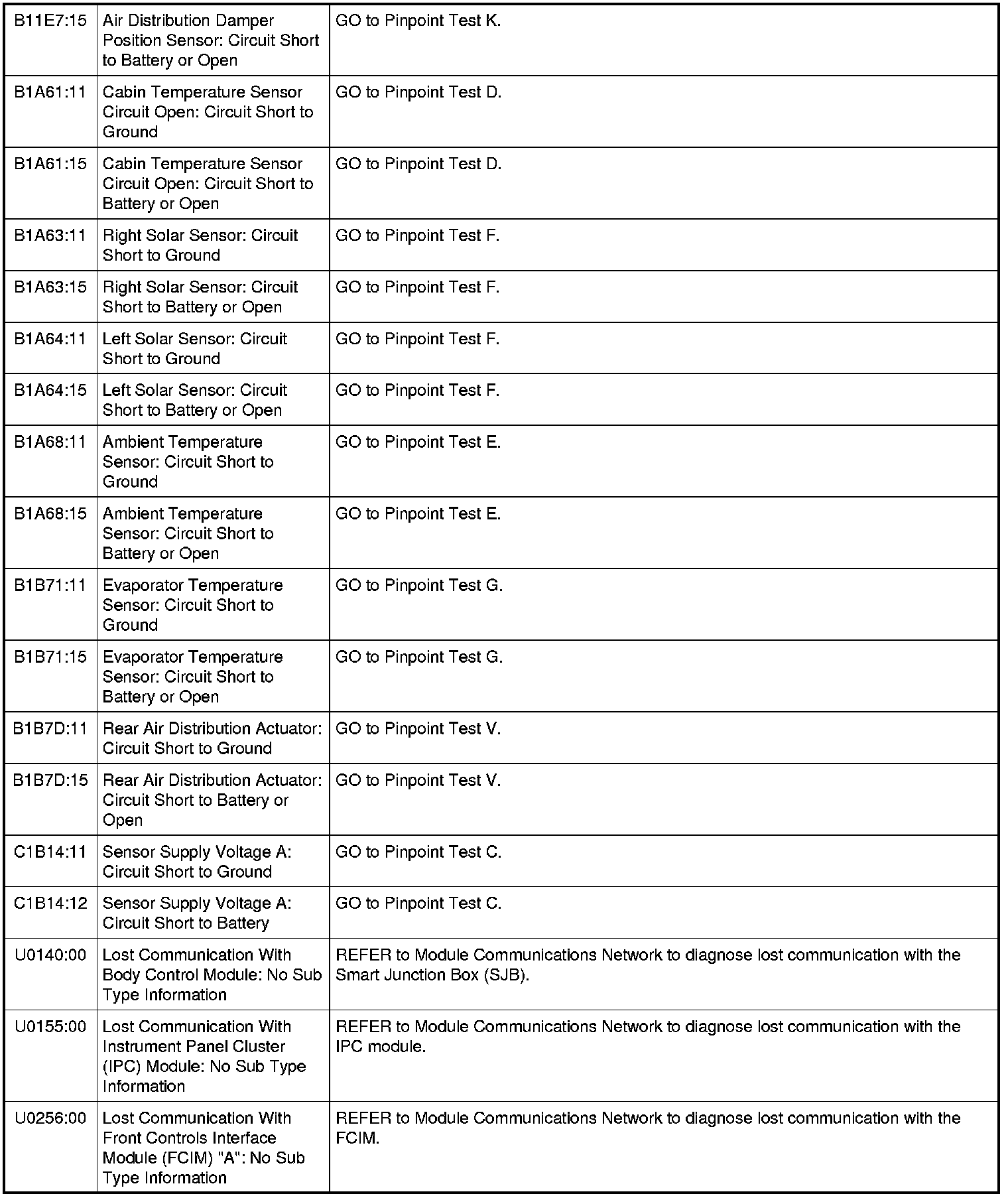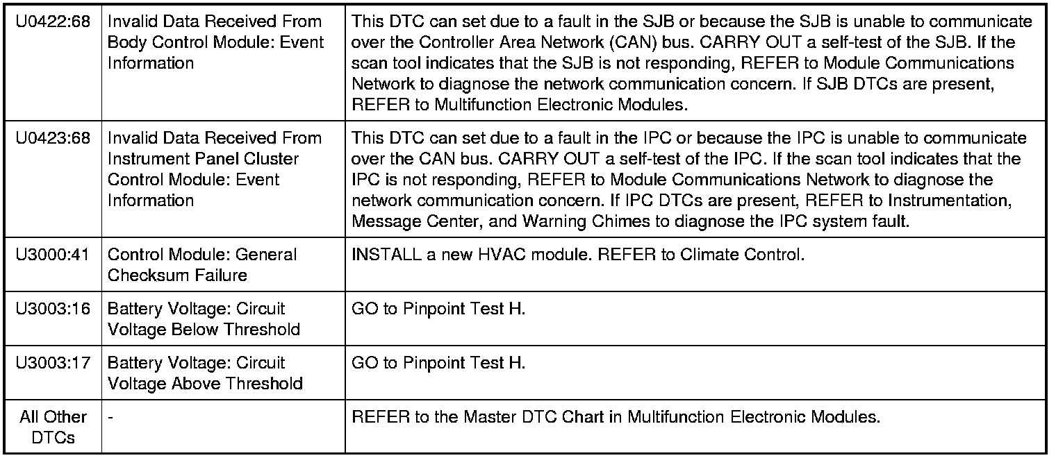 Home >> Ford >> 2011 >> Flex FWD V6-3.5L >> Repair and Diagnosis >> Heating and Air Conditioning >> Testing and Inspection >> Diagnostic Trouble Code Tests and Associated Procedures >> HVAC Module DTC Chart