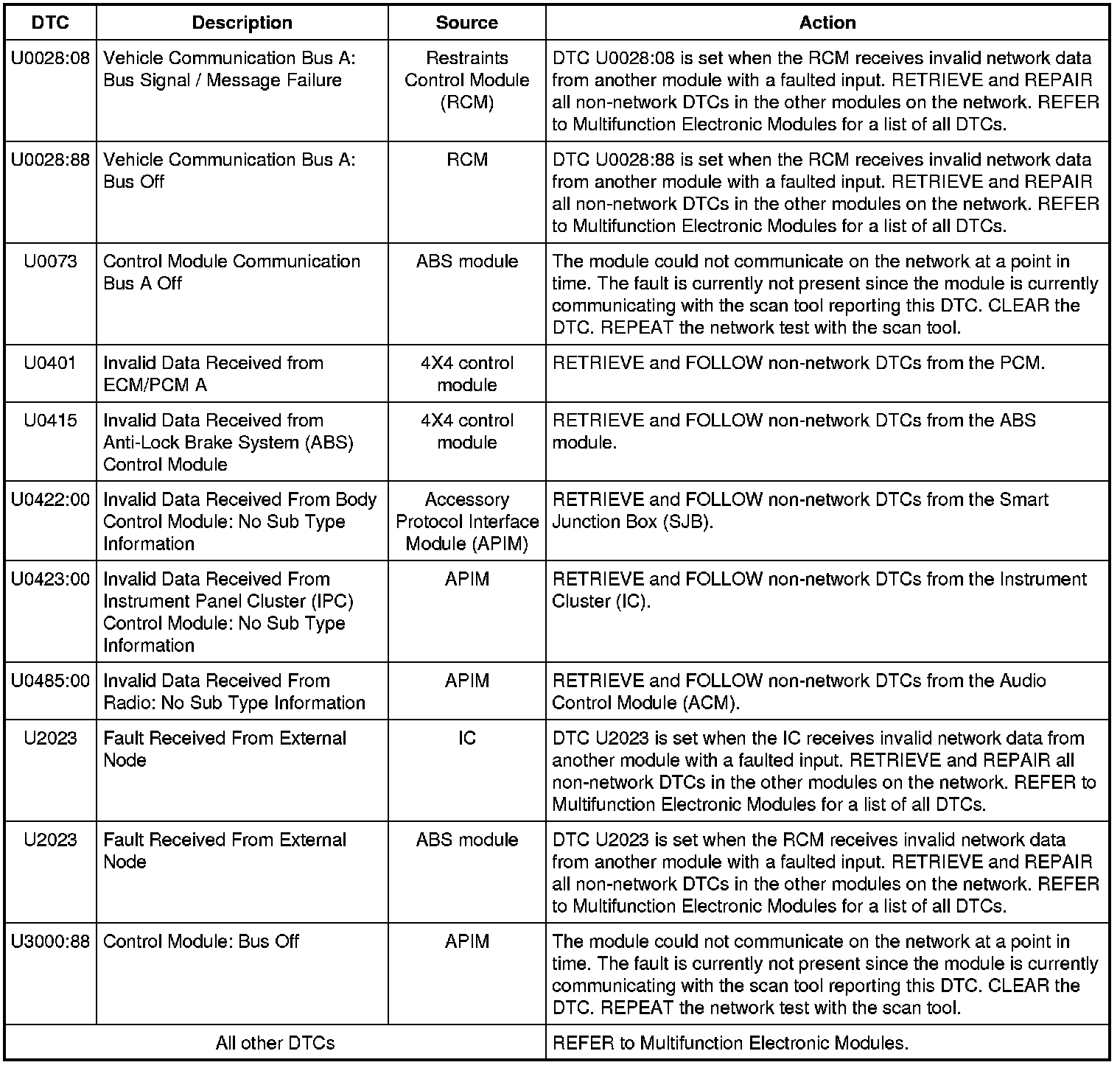 NOTE: Network DTCs (U-codes) are often a result of intermittent concerns such as damaged wiring or low battery voltage occurrences. Additionally, vehicle repair procedures such as module reprogramming often set network DTCs. Replacing a module to resolve a network DTC is unlikely to resolve the concern. To prevent repeat network DTC concerns, inspect all network wiring, especially connectors. Test the vehicle battery condition, refer to Battery, Mounting and Cables Testing and Inspection.
