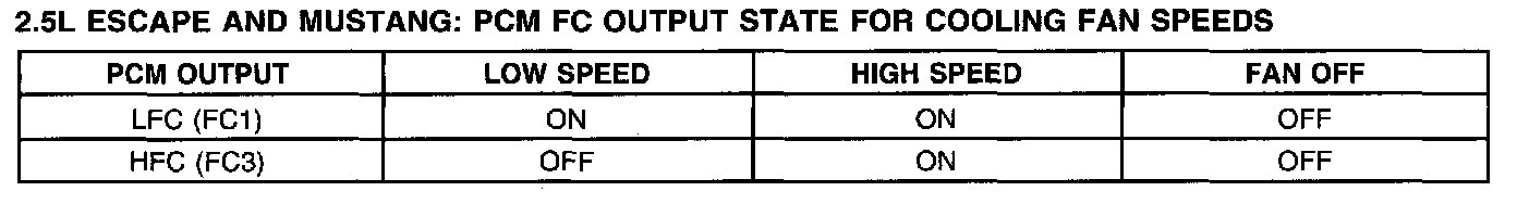 For 2-speed fans, although the PCM output circuits are called low and high fan control, cooling fan speed is controlled by a combination of these outputs. Refer to the following tables.