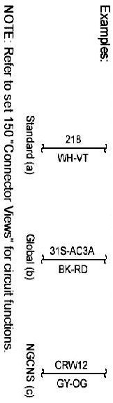 Connector Views show the views of the pins and/or cavities of all connectors. The pin and cavity sides are shown separately as if the connector were disconnected. The color of the connector housing is indicated next to the connector number when available. The harness causal number is located above the connector view and below the connector number. The circuit function charts are located below each connector. The wiring harness designations are listed in Component Location Charts.