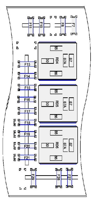 Fuse/Locations and Relay/Locations contains a view of the fuse/relay box, in which all fuses and relays are identified, numbered and named. Fuse and relay numbering and naming follow the indication of the fuse panel cover. In addition, for all removable relays, pin positions are added to illustrate proper orientation.