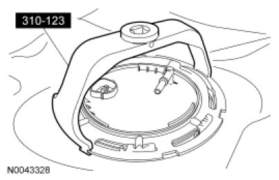 3. NOTICE: Carefully install the lock ring wrench to avoid damaging the Fuel Pump (FP) module when removing the lock ring