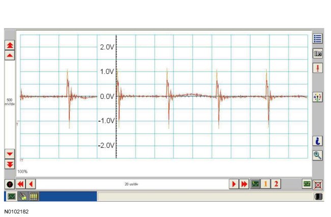 Traces below are viewed at 500mV per division (vertical axis) and 20 microseconds (20�s) per division (horizontal axis). Readings taken with a different oscilloscope vary from those shown. Compare any suspect readings to a known good vehicle.