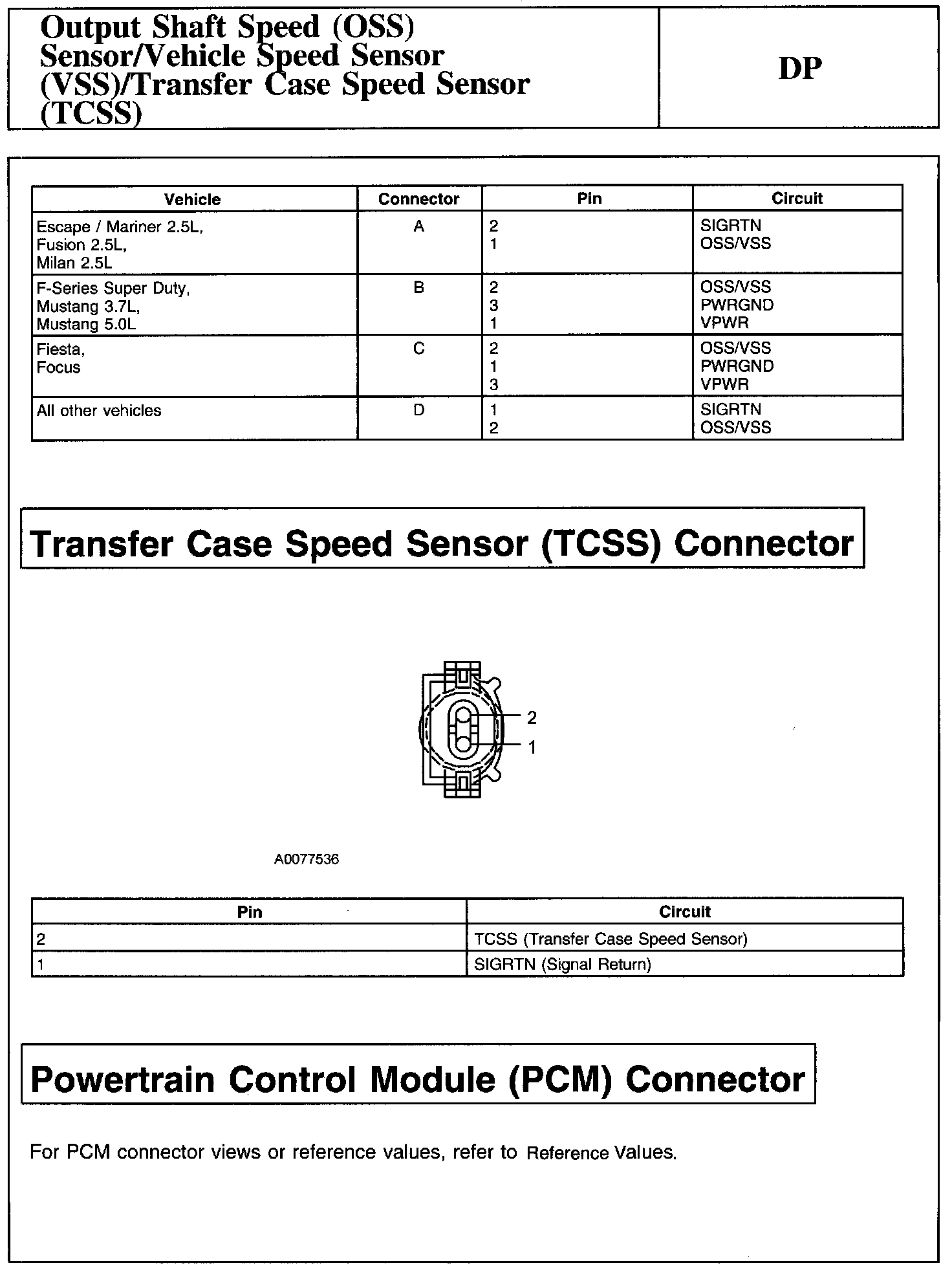 Home >> Ford >> 2011 >> Focus L4-2.0L >> Repair and Diagnosis >> Powertrain Management >> Computers and Control Systems >> Testing and Inspection >> Pinpoint Tests >> Test DP: Output Shaft Speed (OSS) Sensor/Vehicle Speed Sensor (VSS)/Transfer Case Speed Sensor (TCSS)