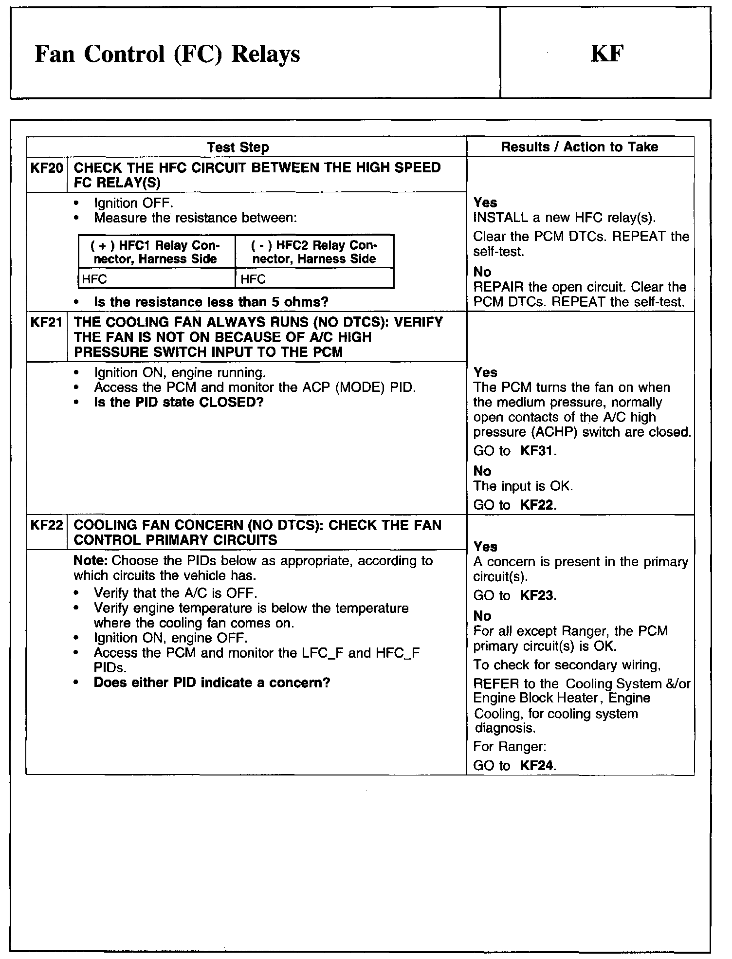 Home >> Ford >> 2011 >> Focus L4-2.0L >> Repair and Diagnosis >> Powertrain Management >> Computers and Control Systems >> Testing and Inspection >> Pinpoint Tests >> Test KF: Fan Control (FC) Relays