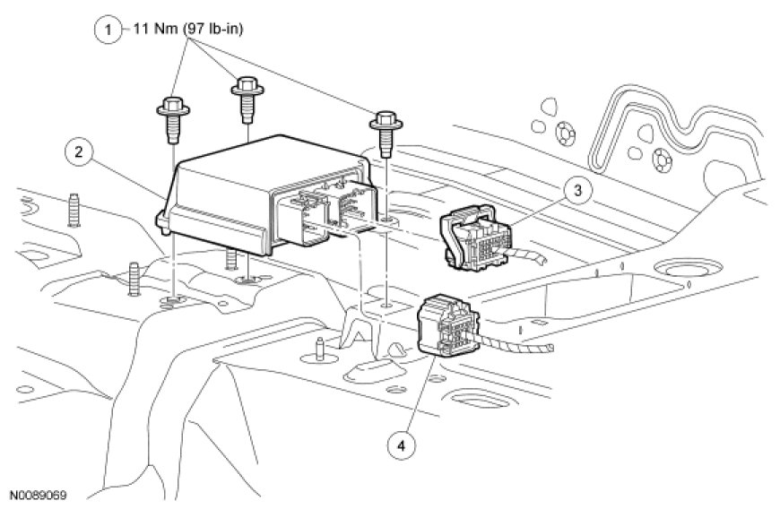 1. WARNING: Always tighten the fasteners of the restraints control module (RCM) and impact sensor (if equipped) to the specified torque. Failure to do so may result in incorrect restraint system operation, which increases the risk of personal injury or death in a crash.