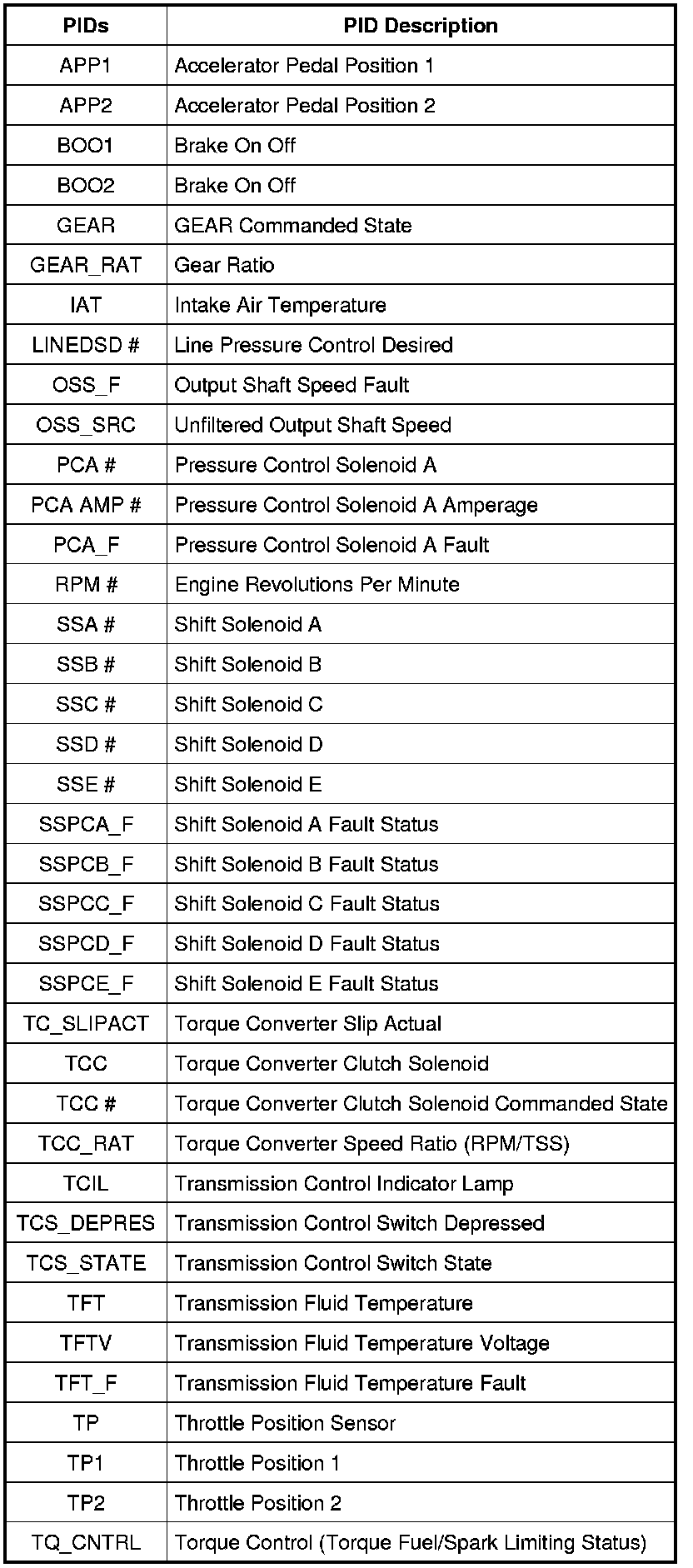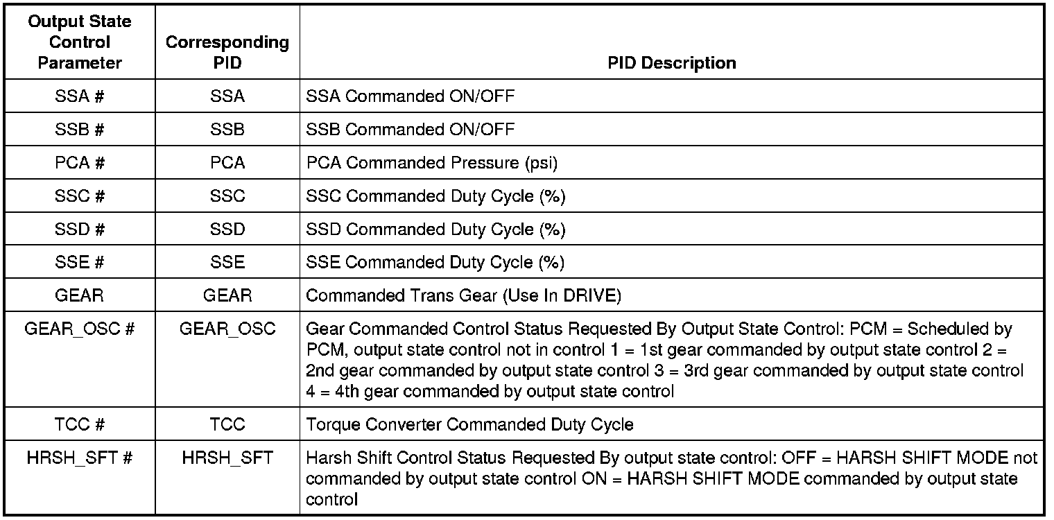 To confirm that the output state control value was sent by the scan tool and the PCM has accepted the output state control substitution, a corresponding PID or PIDs for each output state control parameter should be monitored. Additional PIDs should be monitored to help the technician adequately diagnose the transaxle.