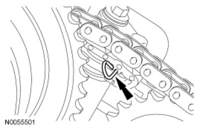 14. Install the primary timing chain with the colored links aligned with the timing marks on the VCT assemblies and the crankshaft sprocket.