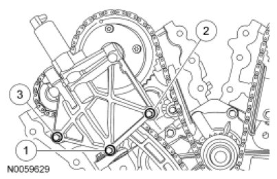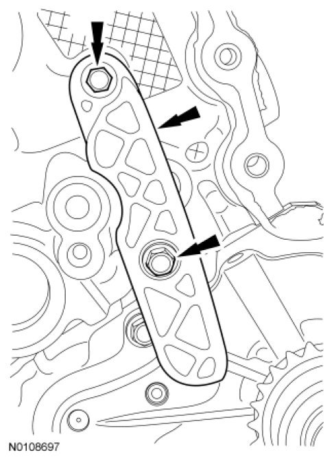 NOTE: The engine comes equipped with either a composite RH timing chain guide requiring the timing chain to ride on the outer side of the guide or a stamped steel RH timing chain guide requiring the timing chain to ride on the inner side of the guide. All replacement RH timing chain guides will be the stamped steel design.